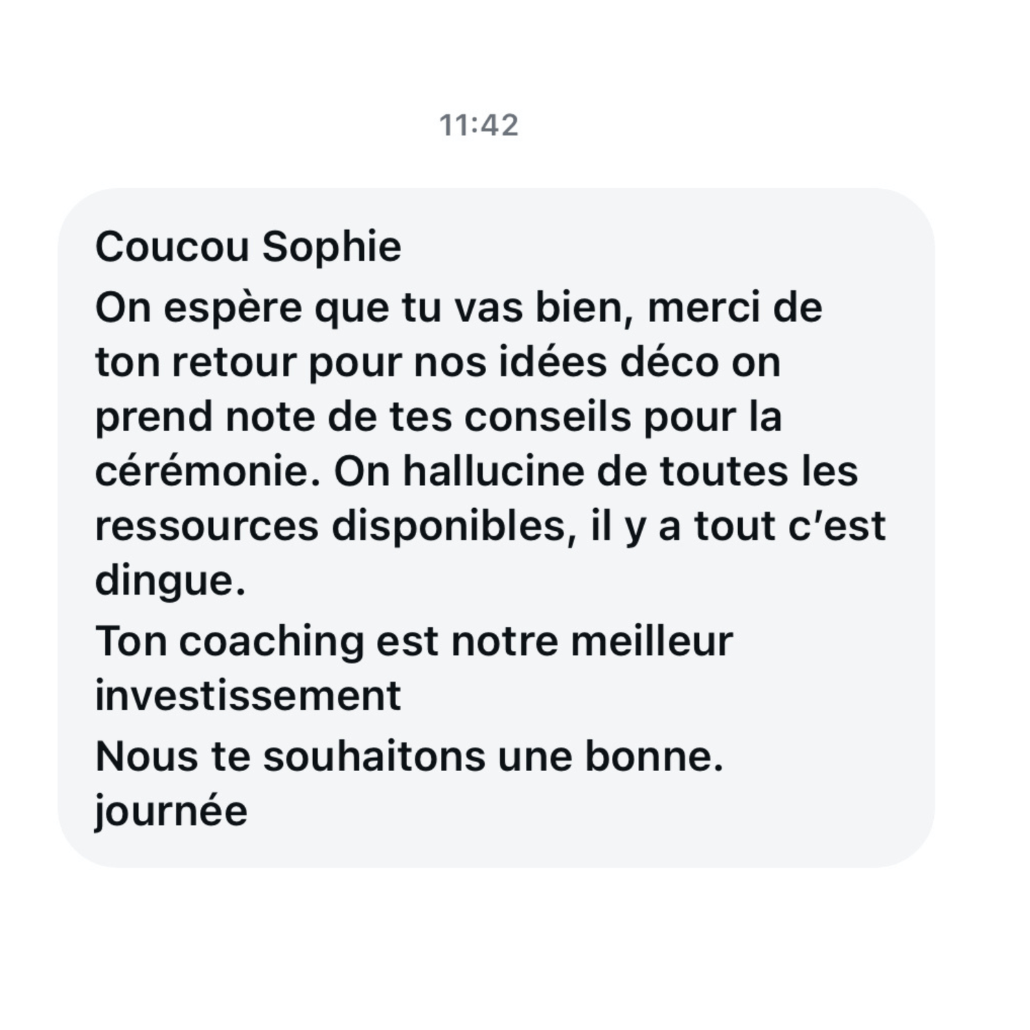 ✅ Ce coaching, c'est la méthode que j'ai utilisée sur le terrain, sur plus de 50 mariages réels, de tous styles, budgets et formats.