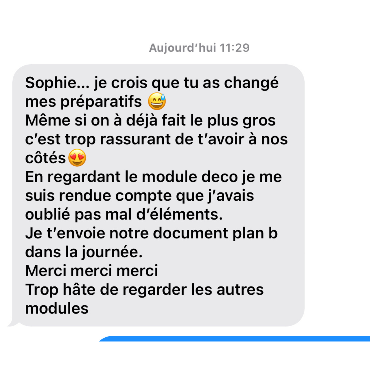 👉 Tout est centralisé, fini les feuilles volantes et les recherches sur internet à n'en plus finir. Tout est là, et vous, vous avancez à votre rythme, vous construisez votre jour sereinement !