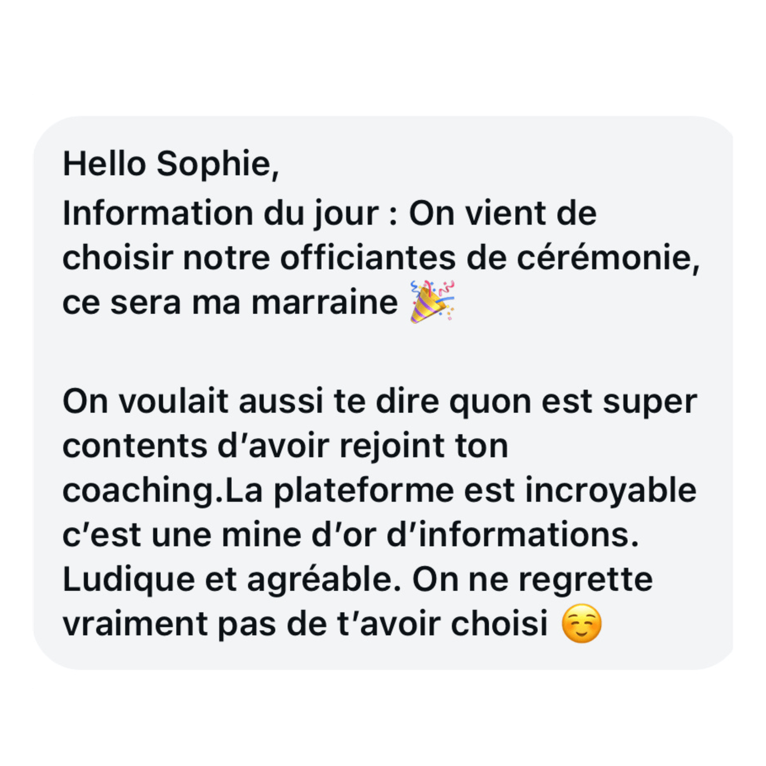 Mais si vous avez le moindre doute avant de vous lancer, regardez la vidéo de visite guidée, posez-moi vos questions, ou contactez-moi directement par mail hello@myweddingboost.com ou Instagram @myweddingboost_